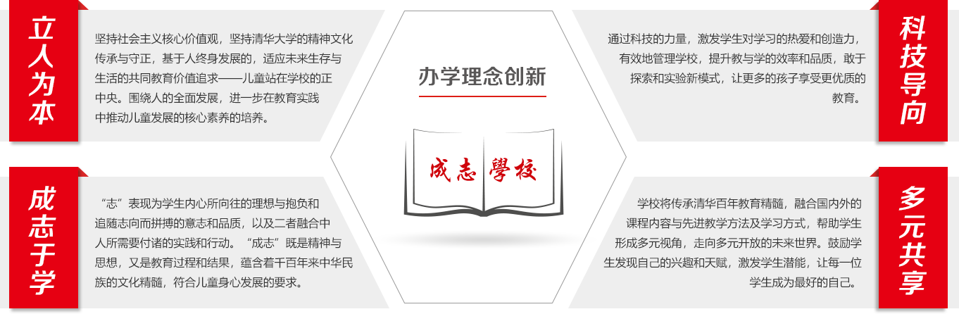 成志未來(lái)學(xué)校,是一所面向未來(lái)的創(chuàng)新學(xué)校;以學(xué)習(xí)者為中心,依托清華優(yōu)質(zhì)教育資源,海納全球名師,通過(guò)科技的力量創(chuàng)新教育,將國(guó)際先進(jìn)的教育理念、教學(xué)模式、學(xué)習(xí)方式與中國(guó)基礎(chǔ)教育完美融合;讓孩子們享受更好的教育,成為更好的自己。